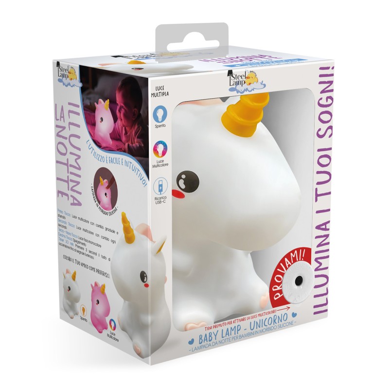 Baby Lamp Unicorno è una soffice lampada notturna in silicone pensata per i più piccoli. Priva di BPA